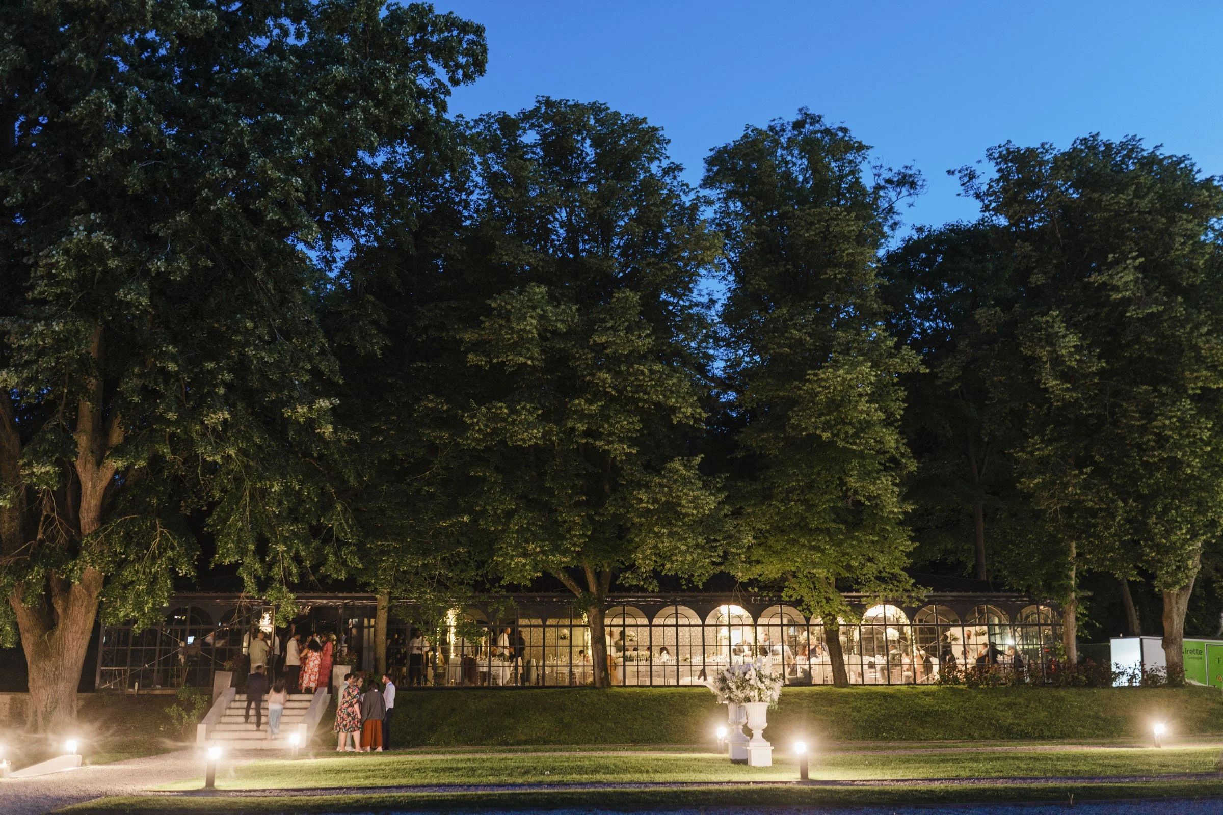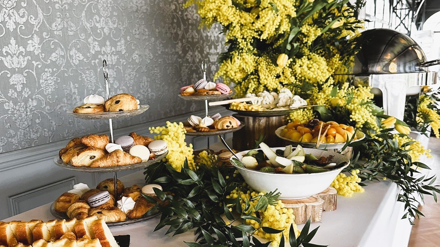 Sous la charpente et les verrières de l’Orangerie, la lumière souligne les tables et les allées du buffet ; le décor patrimonial magnifie les couleurs créoles pour une expérience à la fois chaleureuse et précieuse.